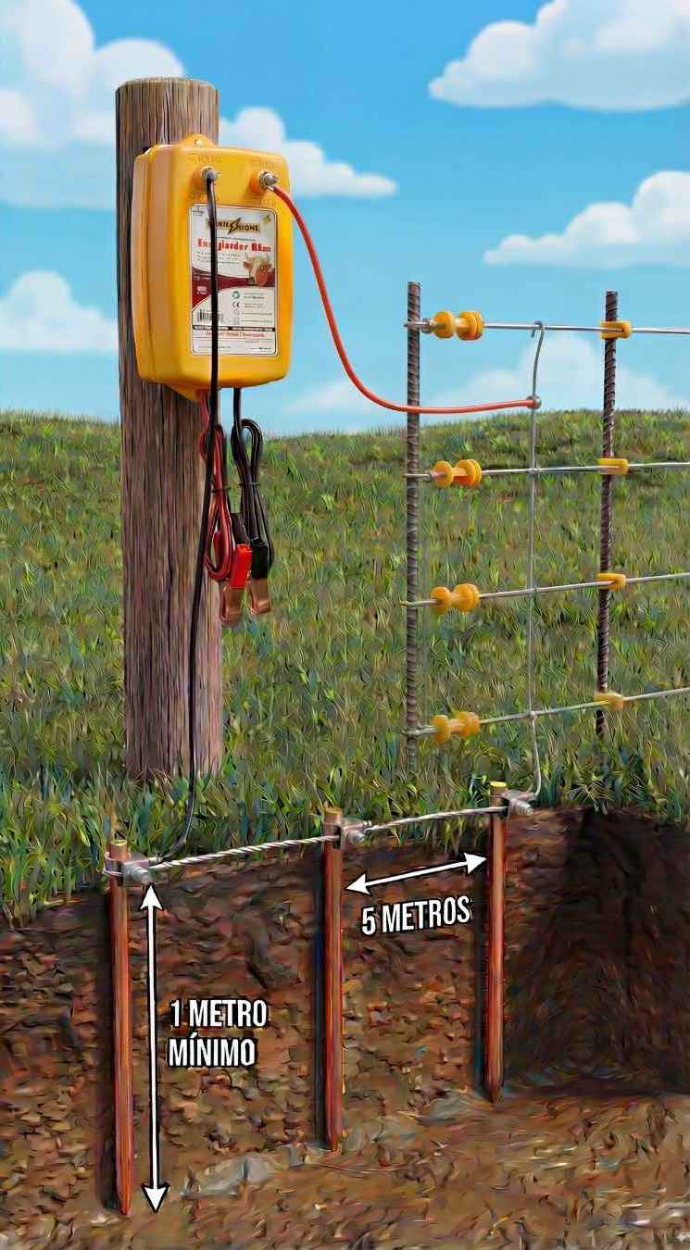 Para que el sistema funcione al 100%, recomendamos instalar 3 varillas de cobre conectadas en serie, enterradas a una distancia de 3 metros entre cada una. Esto garantiza que el golpe eléctrico sea efectivo.